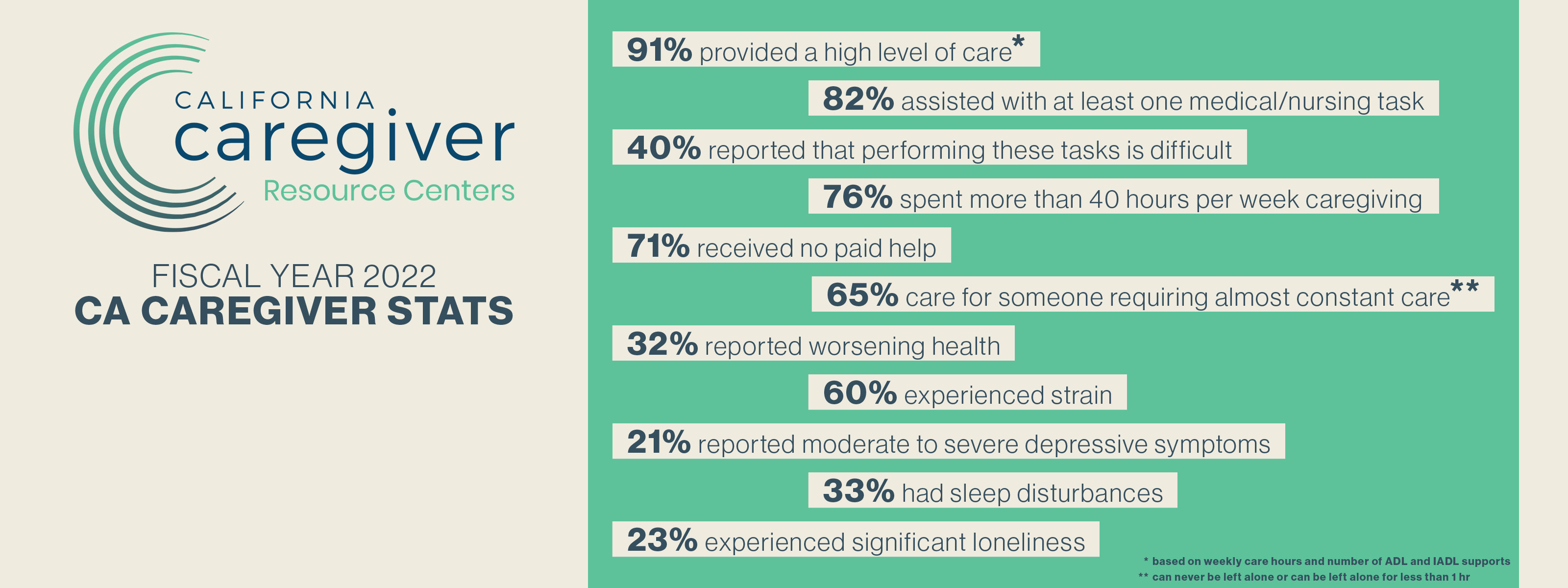 Family Caregiver Alliance is pleased to share the release of our Fiscal Year 2021-22 family caregiver data. This yearly evaluation conducted by the Family Caregiver Institute at the UC Davis School of Nursing analyzed data in CareNav™, an online platform deployed across the California’s 11 Caregiver Resource Centers (CRCs), to provide important insight on the experiences, demographics and service needs of nearly 15,000 California family caregivers of adults with cognitive and physical disabilities.