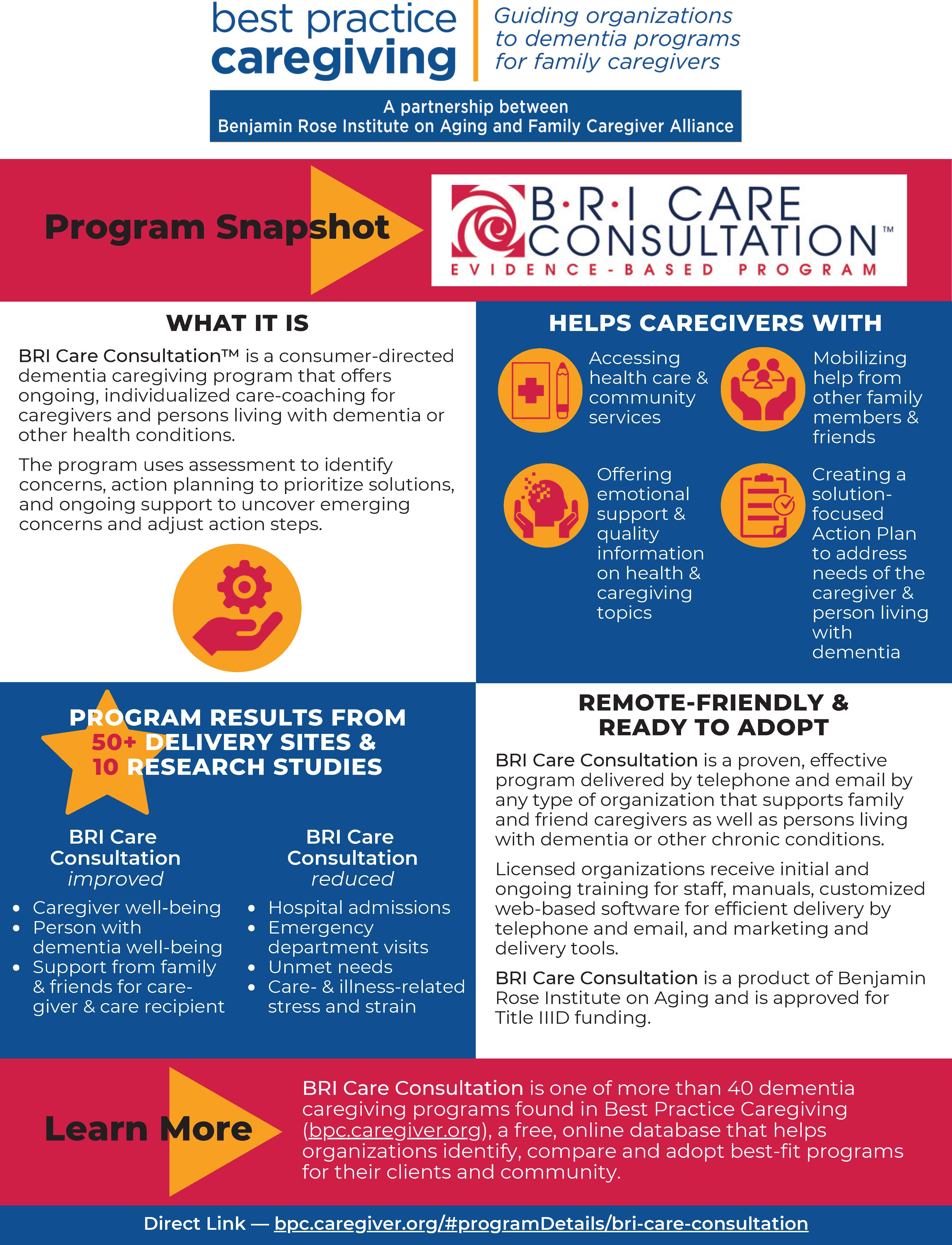 Check out this 1-page infographic for a quick, top-level overview of BRI Care Consultation™, one of more than 40 dementia caregiving programs found in Best Programs for Caregiving.
