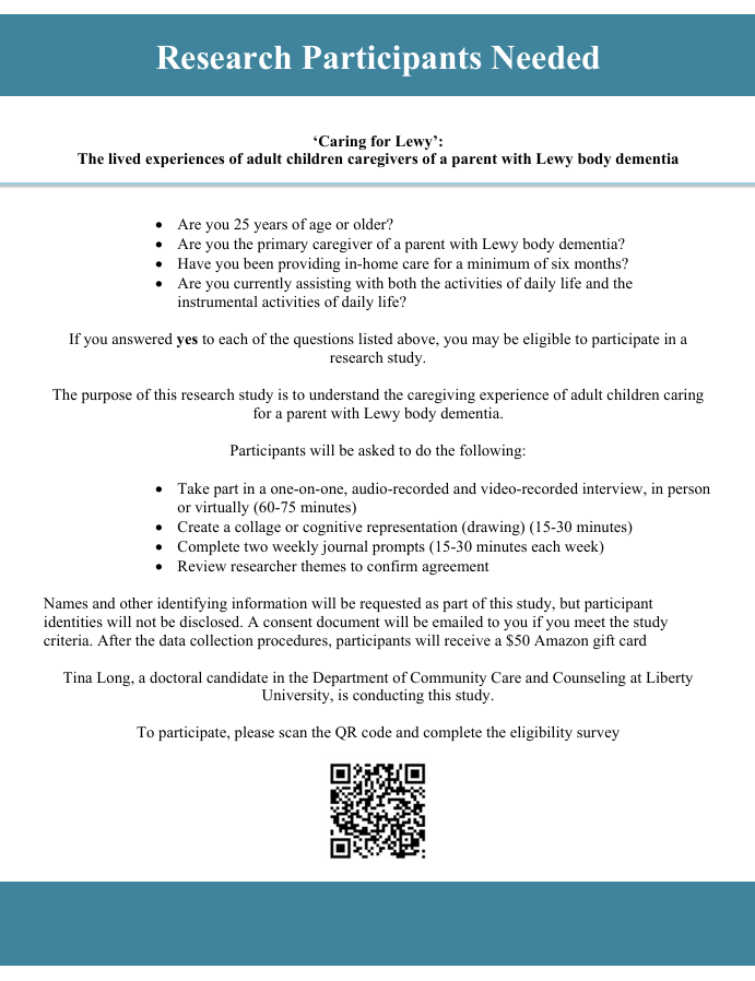 If so, you may be eligible to participate in this research study. My name is Tina Long and I am conducting research for a Doctor of Education degree at Liberty University. The purpose of my research is to understand the caregiving experience of adult children of a parent with Lewy body dementia.