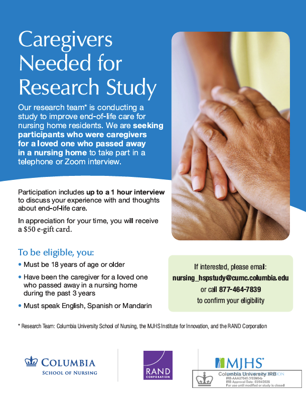 They are seeking participants who were caregivers for a loved one who passed away in a nursing home to take part in a telephone or Zoom interview lasting up to an hour to discuss their experience with and thoughts about end-of-life care. Participants will receive a $50 e-gift card for their time.